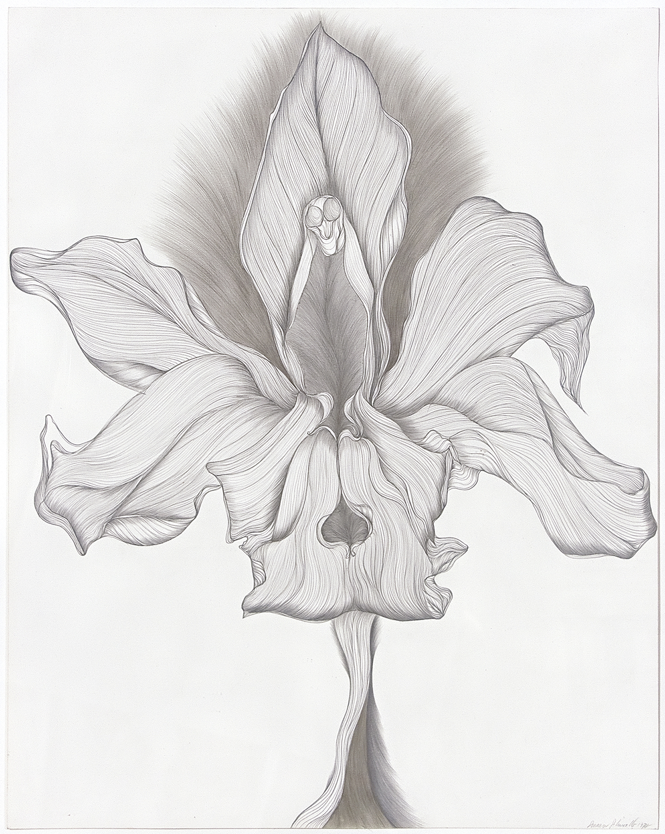 Schwalb began her metalpoint career making drawings of orchids, a motif carrying for her deep personal resonances. When you gaze at her Orchid Transformation #2, which she drew in 1978, you will be struck by the flower’s beauty and nearly muscular power and vibrancy, and as you keep looking, you will feel that it is not just alive, as if it were an actual organism – it is also a symbol for life or rather the way in which life embodies stillness amid rhythm and vitality. Close to Georgia O’Keefe’s flower paintings. Schwalb’s orchids are both naturalistic and abstract.