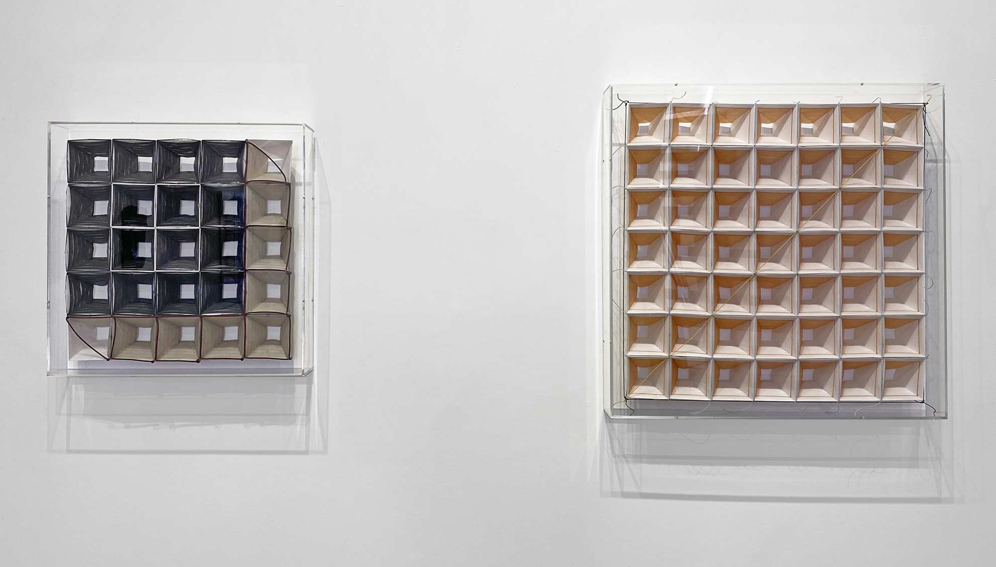 Similarly, the seven by seven cube composition stands in for the 49 days that a wall calendar of seven weeks might represent – a way of storing time spent, and now made visible in the intricacy of its fabrication. As Gampi paper is used in paper screens, windows, and lanterns, its particular sheen and lustre, the 49 cubes serve to sift and reflect their light energy, the ambient illumination displaying the inherent beauty of a Japanese paper perfected over the centuries.