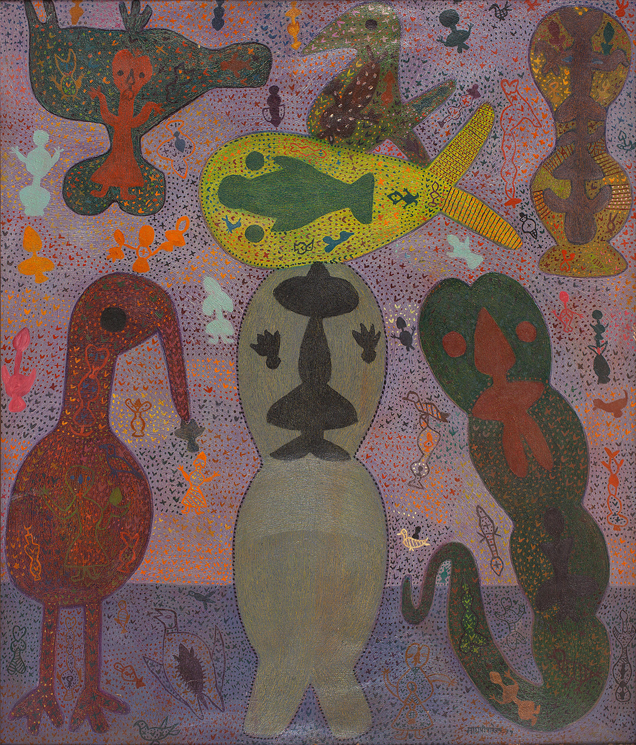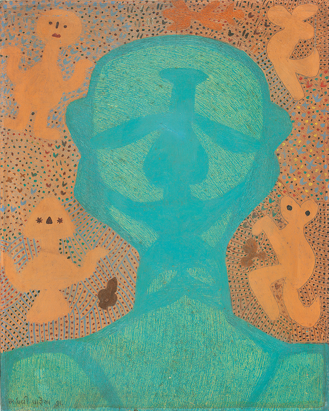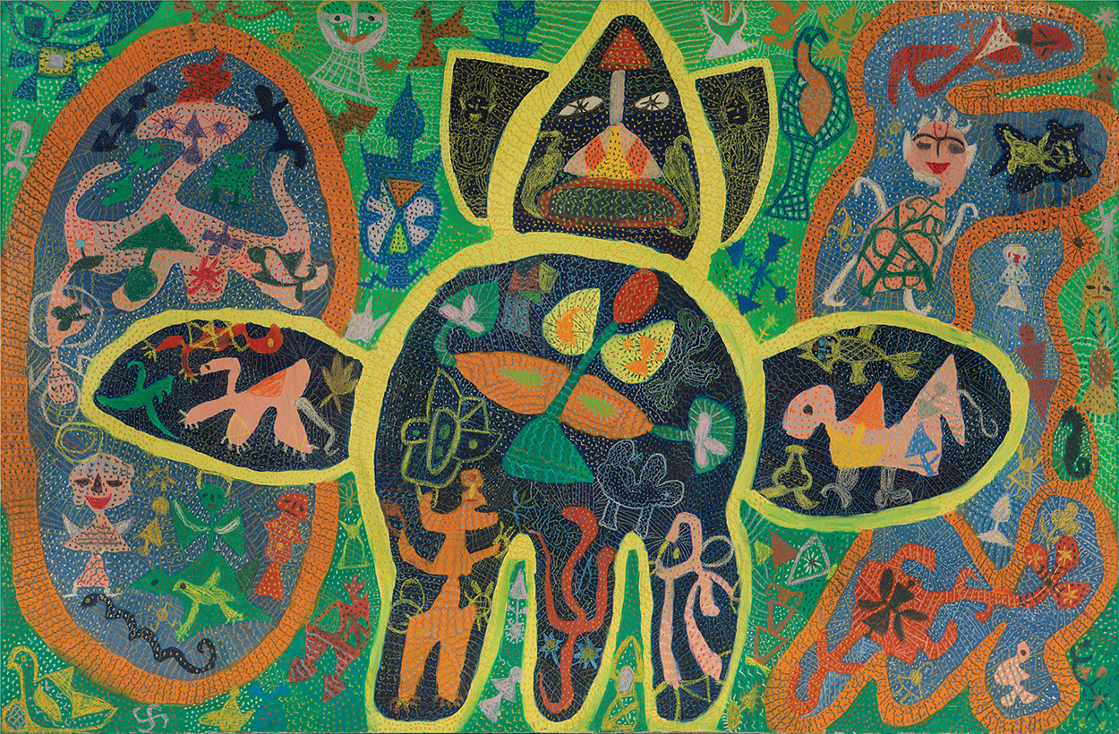If you keep looking at Playing With Animals and look also at other paintings of Parekh’s, such as Sea God (1971) and Fantasy (Under Sea) (1979), you will understand how insightful art critic Gayatri Sinha is when, in a catalogue essay, she sees as “cognate creatures” the human, animal, and hybrid life forms (tree snakes, snake flowers, etc.) that populate Parekh’s ecosphere. These cognate creatures live in a “flattened perspective” that Sinha highlights – a setting in which they enjoy equality and kinship, gods included, in accordance with the previously noted Indian thinking.