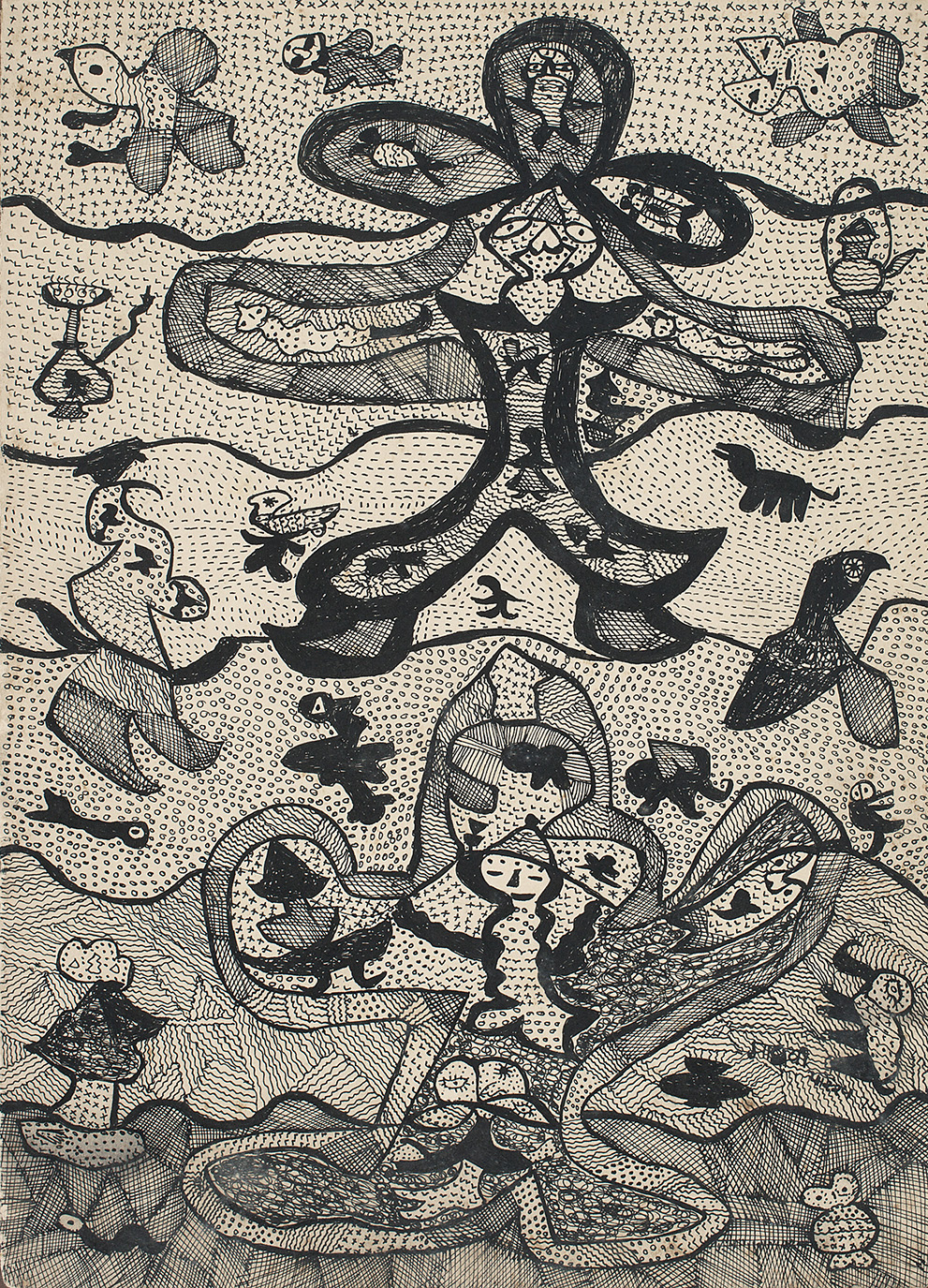 Look at two early works of Parekh’s, both sketches: Running Figure(1972) and Flying Figure (1974). A DAG wall-note highlights the “innate synergy” that connects the myriad elements of each. Wholly apt is this reference to innate synergy. The hybrid figures populating both pictures are whimsically delightful; they also tell you that a form of self-organization may be at play in the world of the biosphere.