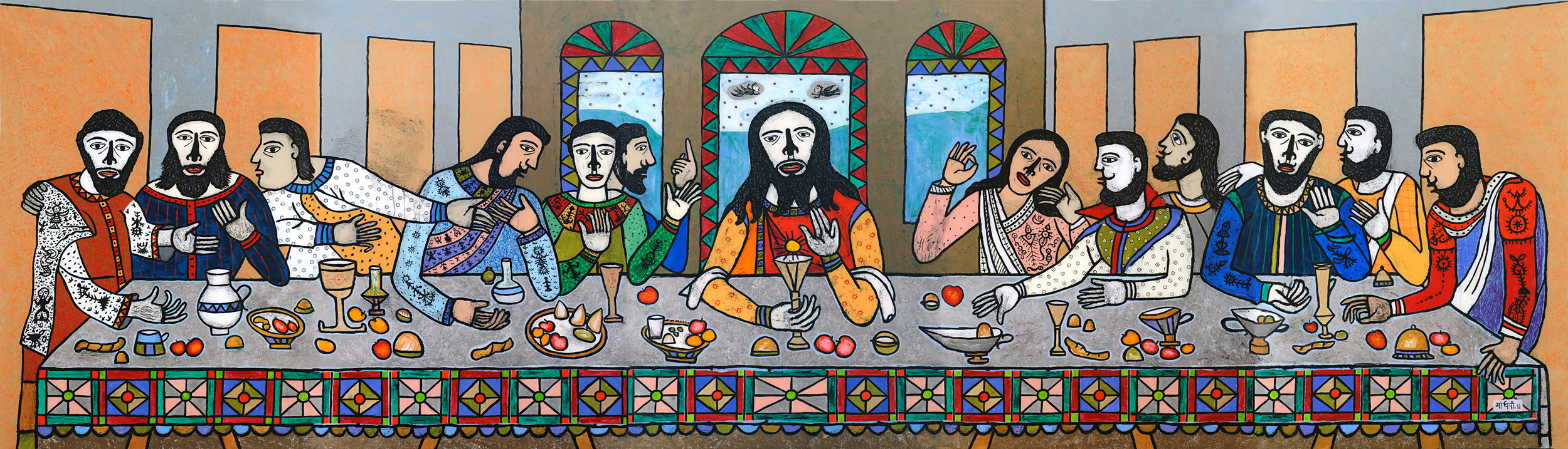 Writing in a catalogue essay about Parekh’s monumental painting The LastSupper (2011), an interpretation of Leonardo da Vinci’s monumental masterpiece, art historian Annapurna Garimella discusses the strategies Parekh uses “to foster identification and empathy” between the viewer and Christ and his disciples. These include depicting Christ holding his left hand in the abhayamudragesture, which represents protection, peace, and the dispelling of fear. Garimella also draws attention to the figures in Parekh’s painting being linked to her earlier efforts to create “animal-like human bodies.” India’s deep culture is at work in the painting, refracted through the prism of Parekh’s great imagination.