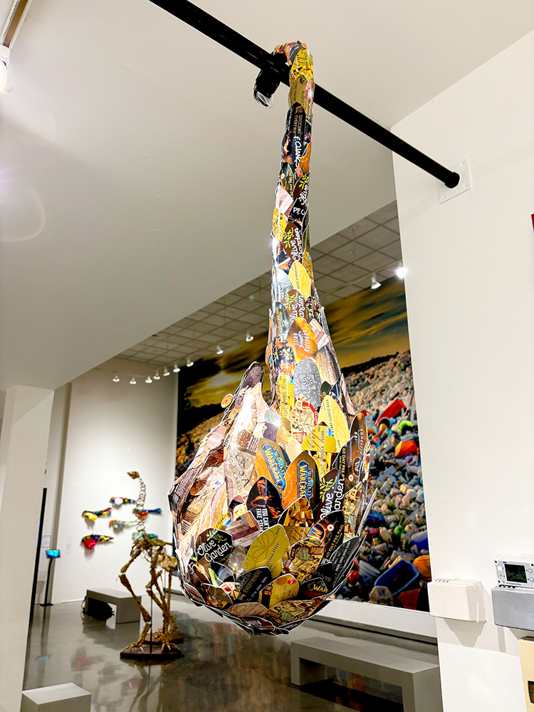 In addition to numerous sculptures, the exhibition features two giant digital prints on fabric that confront the emergency of non-renewable energy and plastic waste and their enduring damage to terrestrial systems. While these immense banners cannot ever be large enough to fully present this unfolding catastrophe, an abstract appreciation for the beauty of materials out of place is obvious.