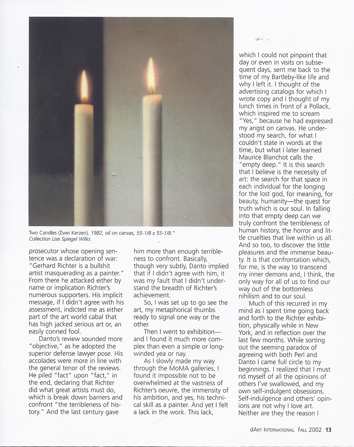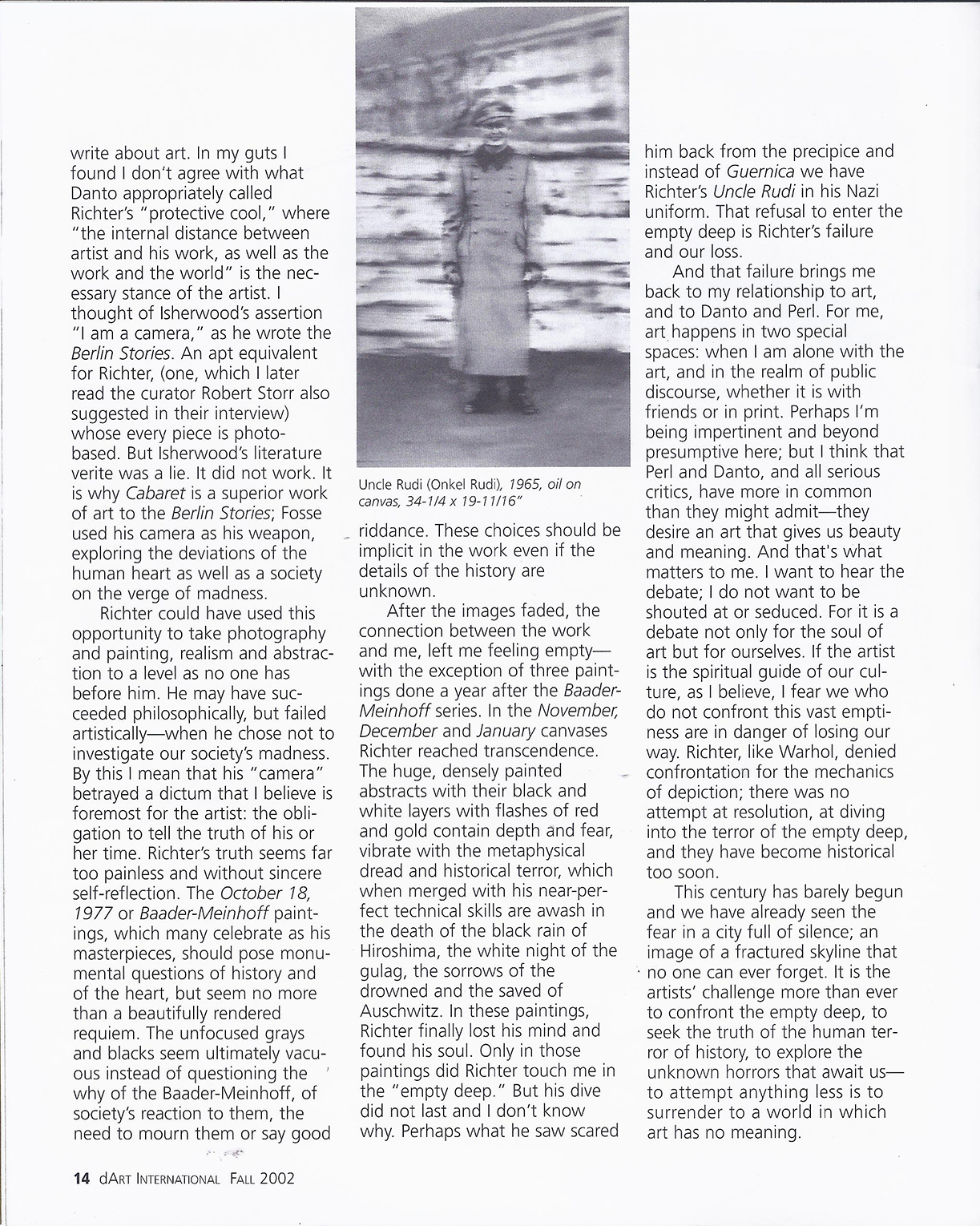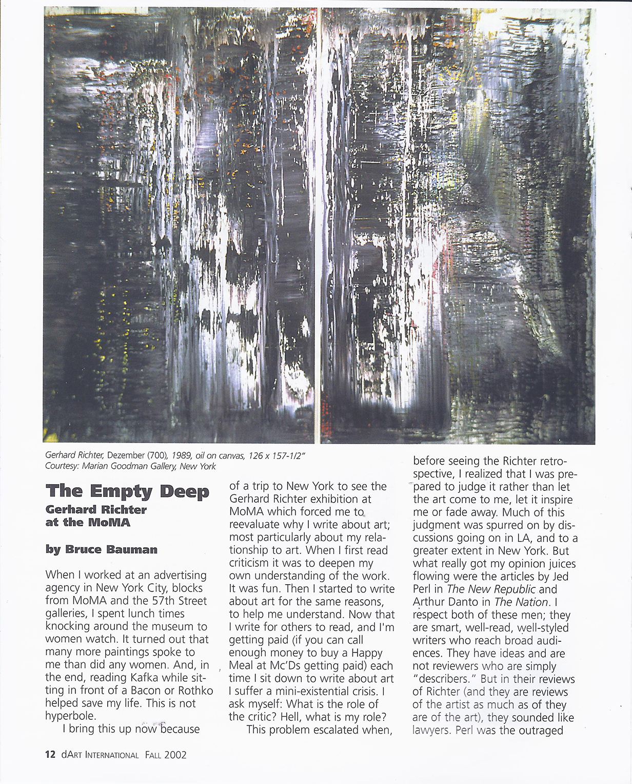 dArt magazine is pleased to introduce TWINNING, the application of a game structure to its Playing Card feature. When presented with cards bearing images from dArt back issues cropped to playing card size, a participant is asked to pair up any two from cards presented. While the choice on the surface may be no more profound than "liking the combination," something deeper may have been at the root of the picks. Even if this is not the case, the resultant pairing of images affords the chance to answer questions that the art itself may be posing. This had certainly been true for writer Bruce Bauman, who in his The Empty Deep article about Gehard Richter said of the exhibition that it "forced me to reevaluate why I write about art."