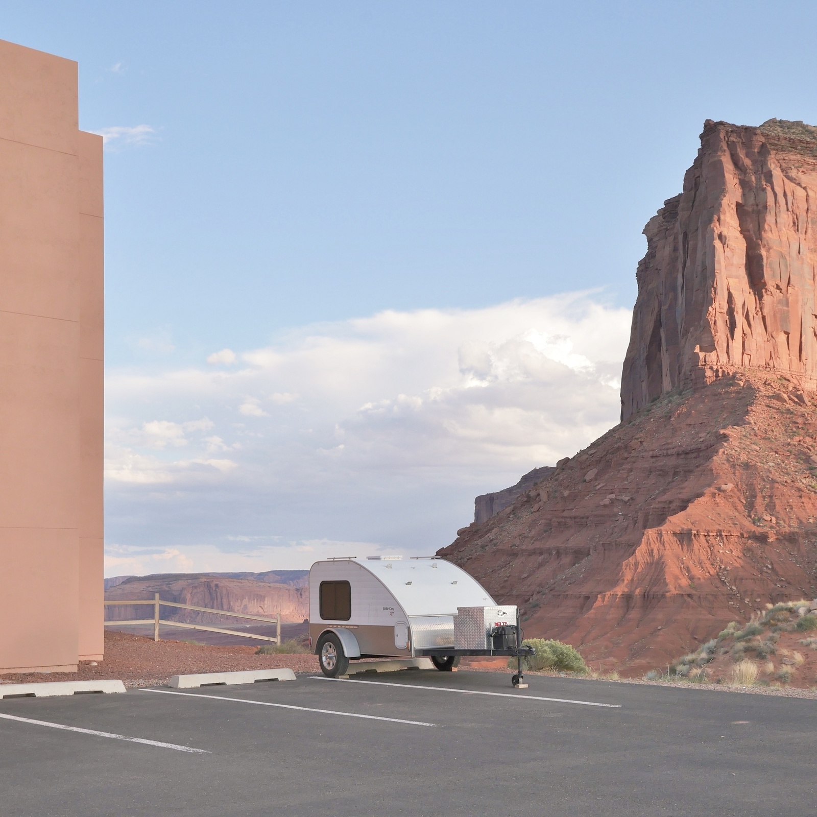 Monzon travels a lot in the American West, around the deserts where urban settlements, surrounded by suburbs, meet industrial areas and a no-man’s lands of rocks and sand. All his images are entirely devoid of humans. Some suggest human occupation such as Urban Sprawl 167, with a parked trailer, parking spots, a strong outline of a building. The grey surface of asphalt ends abruptly at a rock and the landscape takes over. The pervasive colour is burnt sand – the whole area is covered with it, even the building seems to be made from bricks carved from the rock. There are traces of people, the neon sign at Jazzercise is on, there is a light inside the shop and in the building in the background, cars are in the parking lot – but not a single person or animal is around (Urban Sprawl 165). The only living thing is the large cactus, standing in front of a traffic light. The light has turned green – but for whom. Who had to stop and why at the stop sign (Urban Sprawl 164) and walk over the pedestrian crossing? As far as the eye can see there is nothing in that flat landscape that surrounds a sand rock – except emptiness. One can almost hear the moan of the soil cracked by heat, beaten and barren, or the silent cry of a lonely tree fenced out of the garden behind it (Urban Sprawl 165).