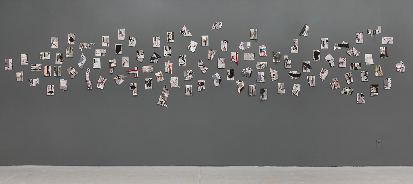 Notes on Clarissa (Volume 1) is a wall of collages of 99 small collages that combine photographic exhibition cards with lightweight synthetic materials that partially obscure the original images. The work is a meditation on 18th-century novel Clarissa by Samuel Richardson, with the individual collages recalling the letters that constitute the novel. Their shard-like appearance and anxious affect suggests psychological facets of the story of a young woman’s seduction and betrayal.