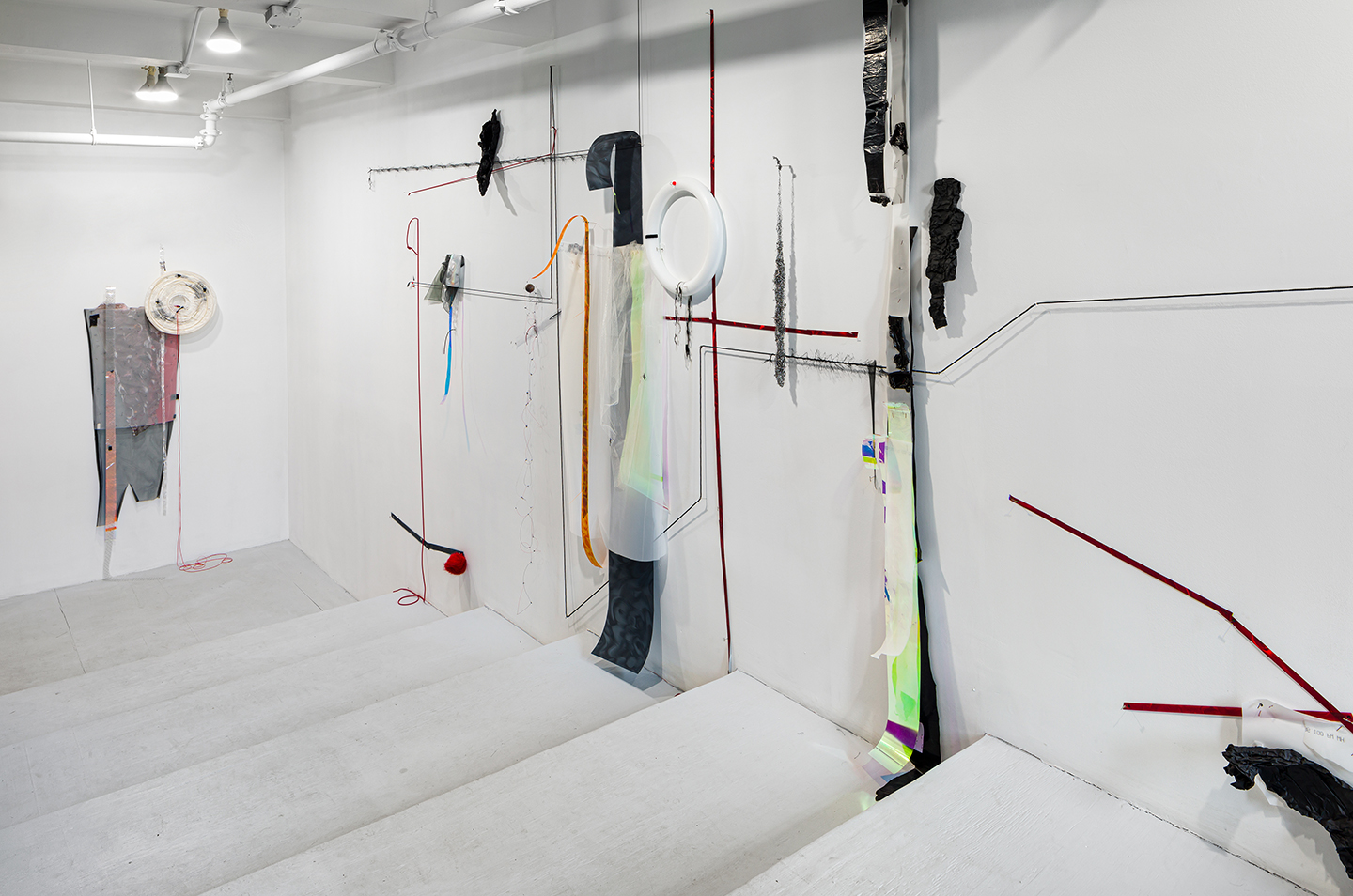 Prologue is a 33-foot-long installation that runs the length of the gallery’s entry stairway. The work moves in step-like fashion, with a compendium of Penn’s favored motifs, materials, and palette of black, white, gray, with accents of intense color, all connected by horizontal linear elements. Layered and affixed to the wall are Mylar, mosquito netting, garbage bag plastic, and found objects. The effect is a of a long, drawn-out echo of the solid architecture, with an array of derelict structures linked by ephemeral connections.