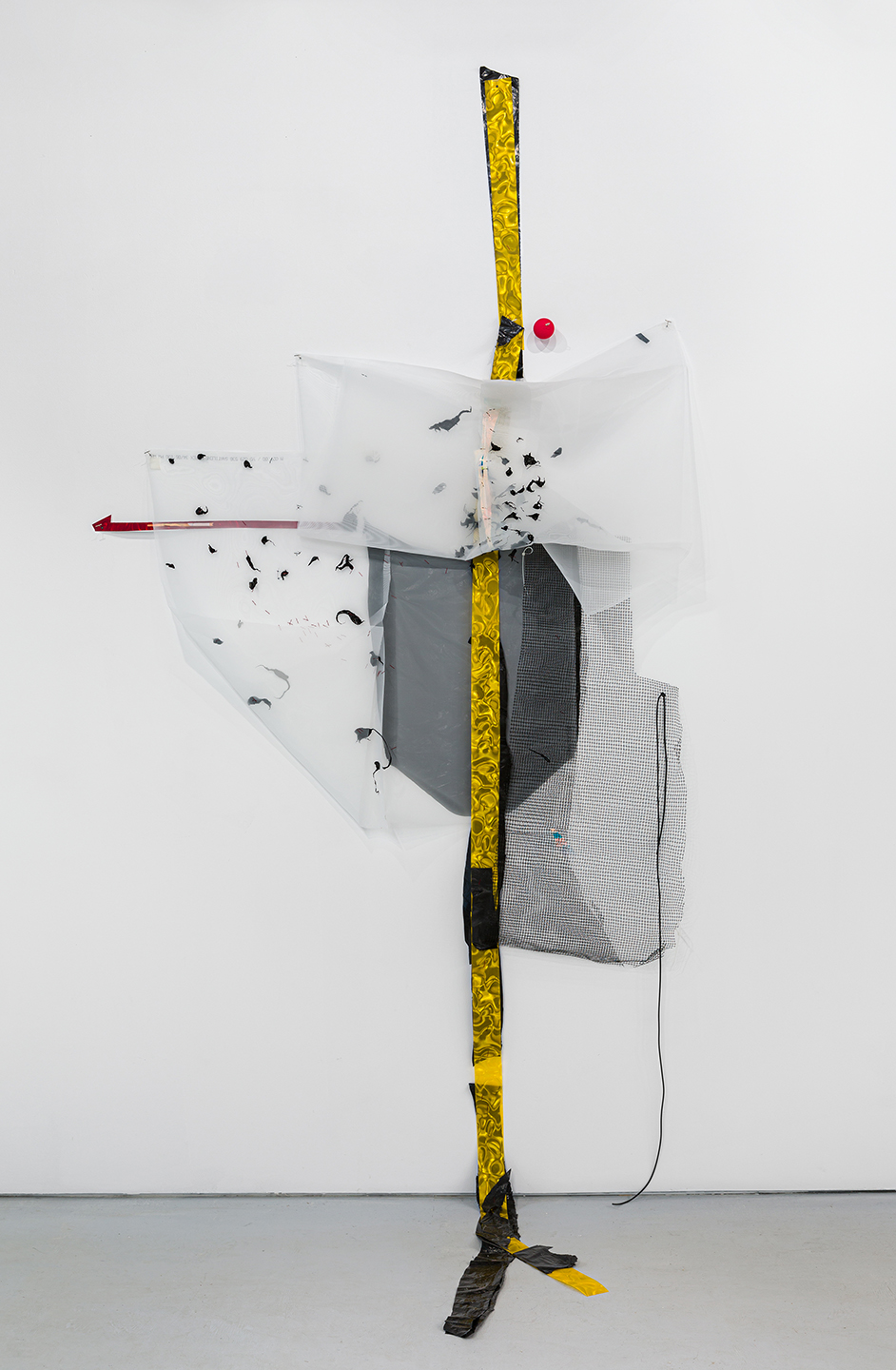 Stele #9 has a long spine of yellow lenticular plastic and a vaguely cruciform arm of red film. The entire off-kilter structure is clothed in polyester mesh, and delicately touched by a swarm of black pigment, giving it an attitude of ramshackle insouciance. Similarly cross-like is Stele #8, whose vertical member of vellum is backed by bedraggled black plastic that falls onto the floor, and a solar plexus of found circular metal.