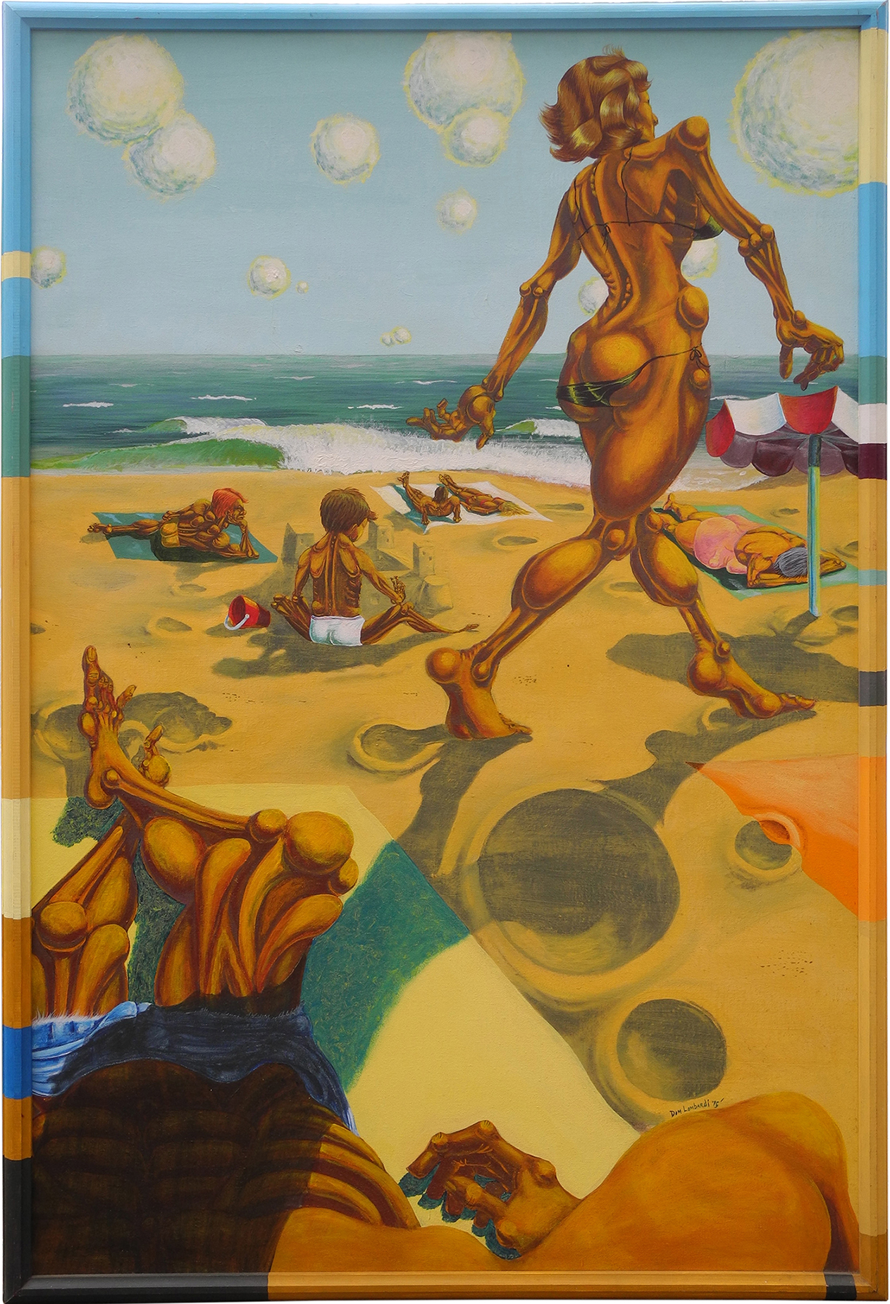 Among his earlier works like Cyborg Sunbathers (1975), the use of the cyborg, like the Surrealist use of the automaton, engages a sense of the uncanny. The large central female figure casts a ominous shadow on the headless foreshadowed male laying at the bottom of the canvas. The main pair are of comparable size, while the others in the composition are much smaller in comparison. At the same time, the large ominous female figure’s import is in the visual effects of her present, which contrast with the logic of the rest of the painting. As a femme fatale type, her shadow looms large and in contrast to the logic of the rest of the painting. At the same time, the series of circles throughout the canvas from the figures’ joints, to the clouds, to the sandy footprints, carry though as a repeated pattern throughout a number of the later works in Lombardi’s oeuvre.
