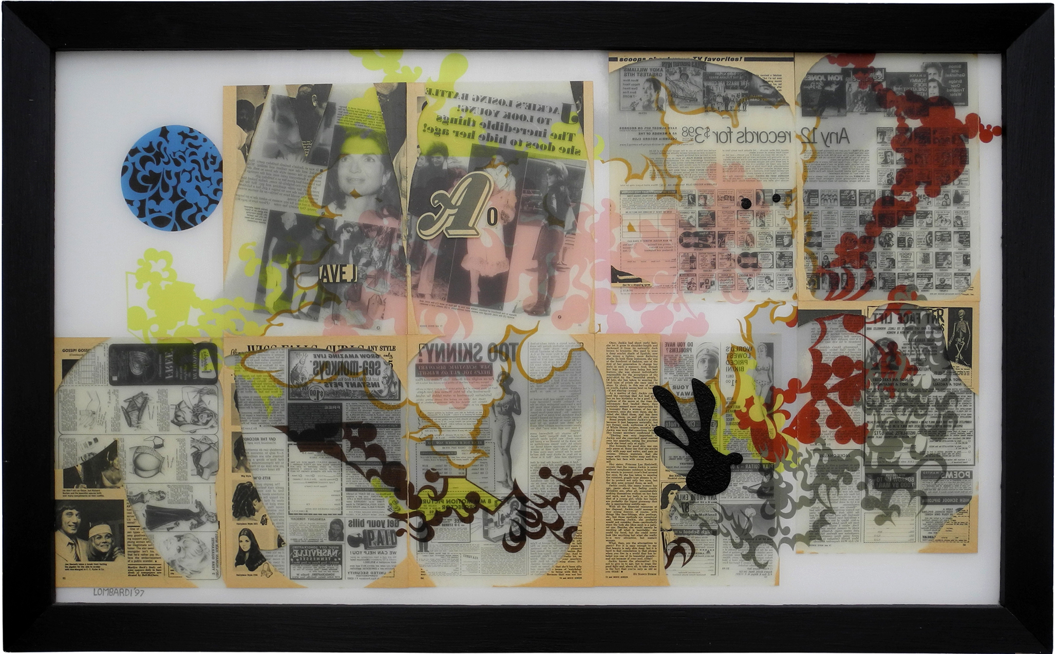 Early on, his paintings begin to incorporate remnants of older canvases, newspapers, stickers, and even plexiglas to create a rich layering of images and meaning. Some of the most exciting aspects of these works are reminiscent Pop and Assemblage, from artists like Eduardo Paolozzi and Robert Rauschenberg. Starting in the 1990s, Lombardi’s Reverse Collage series creates visually dynamic layers of form and language. His use of newspaper clippings, create ghosts of the physical object whose materiality have been rubbed away. This creates an oscillation between recognition (like Jackie Kennedy in Reverse Collage #26, 1995) and obfuscation. Similarly, the Cross Contamination series channels the popular counter cultural use of stickers to cover the public visual landscape. The underlying paintings and digital prints serve, in various ways, to signal the past cultural norms being covered, updated, and altered by the younger generation and/or the new popular culture. The designed stickers have formal comparisons to his other works that come before; and serve, like the material manipulations in Reverse Collage series, to both reveal and hide layers of meaning.