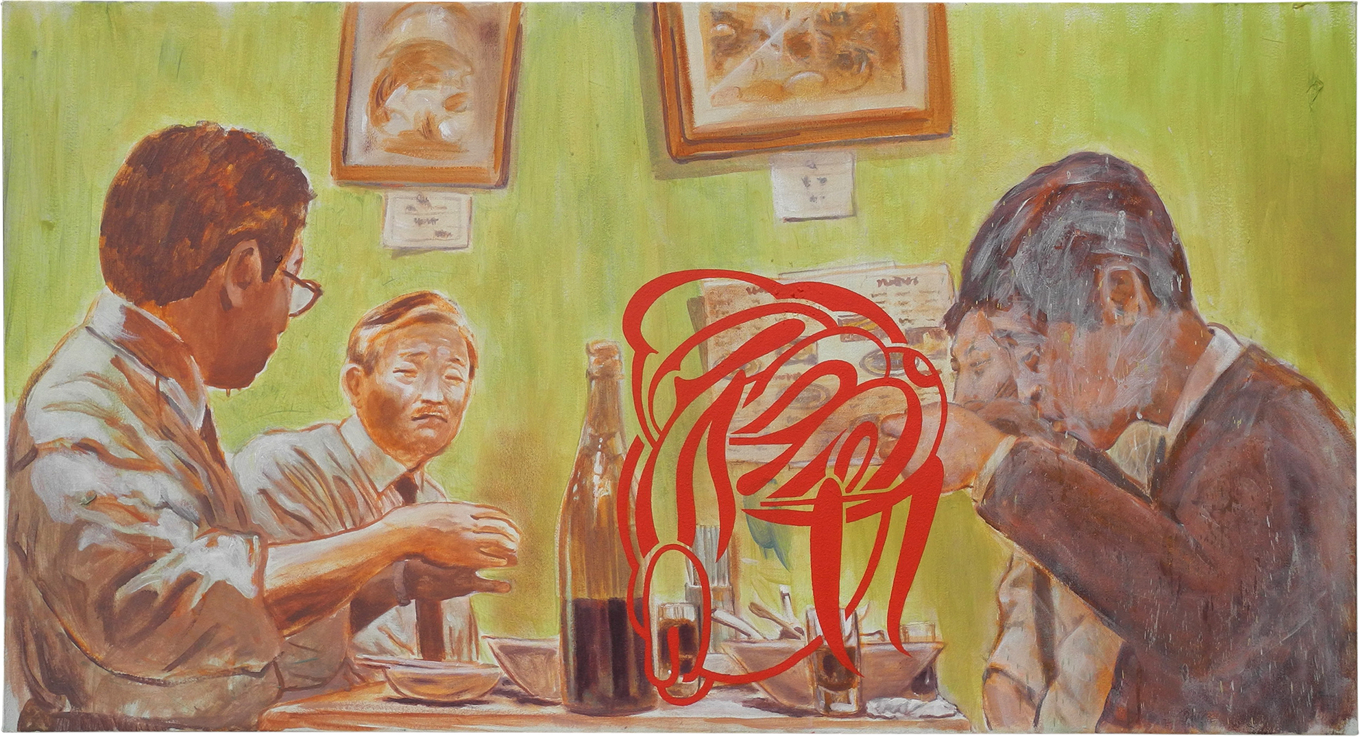 The centrality of the idea of the “collective unconscious” in Lombardi’s conception of the work is used to explain all these aspects; and the exhibition includes a series of works titled Collective Unconscious. The Jungian concept focuses on the idea that archetypical imagery connecting humanity. Lombardi’s divergence from the Surrealist canon, which favored Freud’s more individualistic ideas, however, is still connected to an early twentieth-century Euro-American psychological discipline. In the end, Lombardi’s “collective consciousness” is decidedly from a particular American perspective. This, sometimes uncritical, American perspective is most clearly apparent in the Tattooed series. In the 2000s Tattooed series, Lombard uses overlaid designs reminiscent of popular tattoo designs on new or recycled canvases. According to the artist, the Tattooed series imagines a future breakdown of society when only children survive. In this future, the most important aesthetics are American tribal tattoos, which were designs originally culturally appropriated from Polynesian indigenous rites and popularized in the U.S. in the 1990s and 2000s. Here the tattooed overlays are painted as signals to the childish, debased, popular visual culture, but without a critical engagement with the nature of the source images as colonialist. As in the later the Tattooed Tokyo sub-series makes even more apparent, these serve as another form of colonial imperialism. Inspired by his trips to Japan and South Korea, this series reads as a kind of contemporary Japonisme.