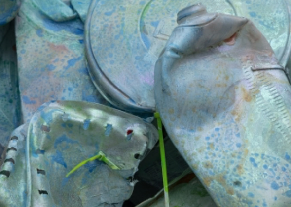 Excerpted from the Regen Projects press release: The works on view reveal Larner’s acceptance of Posthumanist thought that the Anthropocene induces as the world becomes beleaguered by rapidly depleting resources and the massive waste that accompanies our extractive industries. The large low floor sculpture, a sea foam/meerschaum drift, seems to billow and surge through the space. The undulating form constructed of conjoined plastic refuse was collected by Larner over the course of three years. Serving as a meditation on the pervasive and exponential presence of plastic in the world, the sculpture is at once beautiful and horrible, a complex combination that evokes the pathos of its material. This Meerschaum Drift’s materiality belies its intricate form and supposes a transformation of crude material into an art object. Plastic-derived acrylic paint applied to its surface gives the sculpture the overall sense of movement in color from deep blue to green to white, evoking the ephemeral quality of sea foam for which it is named.