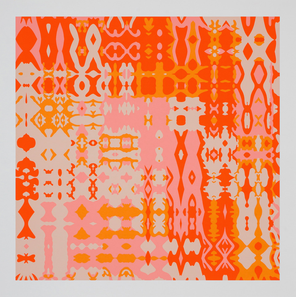 Puns abound in Carl Fudge’s work. An initial loom is formed of Japanese anime and Ukiyo-e prints. Child luminaries radiate mystical powers, while behind screens, kimonos beckon. To transmit the electricity felt in these genres, the artist wrote a program to simulate children’s paper cutouts. Thereby, applying the algorithm, hereconstitutes the Japanese visual systems into new offbeat schema. In Komposition B, snowflake-y shapes appear in punchy pinks and oranges. Then puzzle-piece lacunas recall Japanese usage of negative space,ma. Fudge’s use of this emptiness amidst the vibratory hues, makes the piece seem bigger than it is. The patterns are given to us close up, evoking a here-ness.