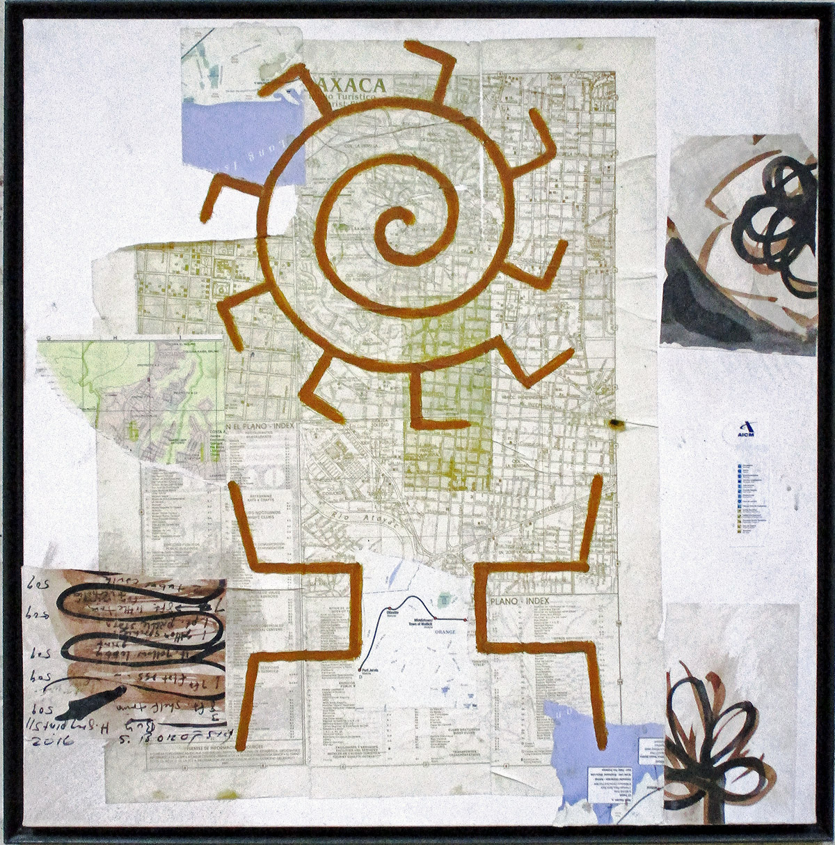 Other influences are Ancient Asian works and African masks, resulting in an assortment of symbolic motifs rendered in a simplistic, stick figure-like format that lends itself well to his signature street art style; a recognizable and readable alphabet that is his own language. His street art and studio practices grew and merged together as demonstrated in this current exhibition on the Lower East Side of Manhattan. The show consists of recent collages and an overview of oil paintings from the past couple of decades, comprising tangled linear elements over fields of color. This is his first solo in 22 years. In his first few solos Borofsky employed mostly found materials. For his show at La Casa Nada on Rivington Street in 1984 almost all of the materials came from the burnt out, rubble strewn vacant lot directly adjacent to the hard scrabble gallery. Those pieces were obviously more sculpturally oriented, yet the same cobbled aesthetic is still evident in his more recent works.