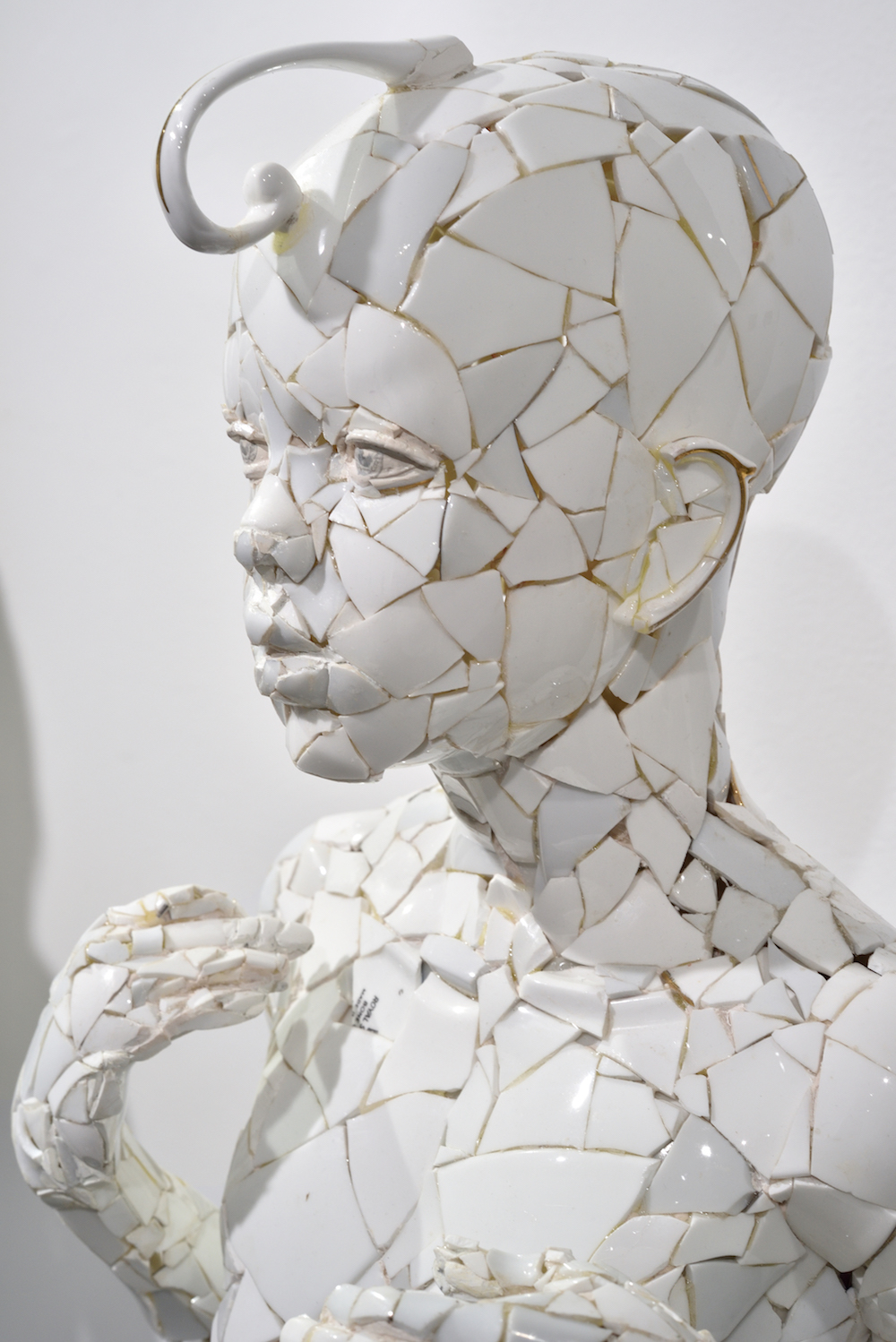 The gallery consists of two fairly small show rooms and an office area (I think there is a bit of storage space tucked away somewhere too). The largest sculptures on display here are by Cathy Lewis. The are made from shards of white porcelain crockery. Two prepubescent figures, a girl and a boy, stand almost four feet tall; next to one another. Strange little curls emanate from their foreheads quizzically (which are actually teacup handles). They are extraordinarily well made and lifelike, formed in accurate simulacrum anatomically, except shattered, fragmented – like fragile elfin jigsaw effigies.