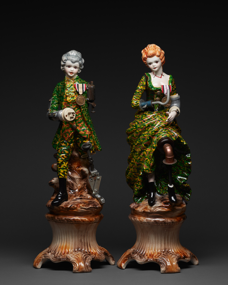 Directly ahead as one enters the gallery, on the far wall, Penny Byrne’s Operation Falconer and Operation Slipper face us side by side; both standing just over two feet high over their pedestals. They both look at us pertly, coquettishly wearing Victorian hairstyles and outfits, yet their garments are carefully painted in military camouflage patterns and they sport army boots in contrast to their coy countenances. However, each has a prosthetic leg and at least one arm replaced by a hook or, what looks like an electrical plug. They both wear heroic ribbons of valor: an obvious jab at the impropriety of social graces and gallantry disguising the ill gotten gains of their social classes. To the left is a bobble headed Donald T dressed up in stars and stripes like the spirit of ’76, while on the other side is a quintet of vintage Dutch porcelain figurines on a plate that look like they have chili peppers for scarves on.